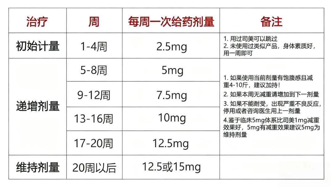 替西帕肽的建议起始剂量为每周一次皮下操作2.5mg,2.5mg剂量用于疗治开始,并不用于全程的血糖控制。
