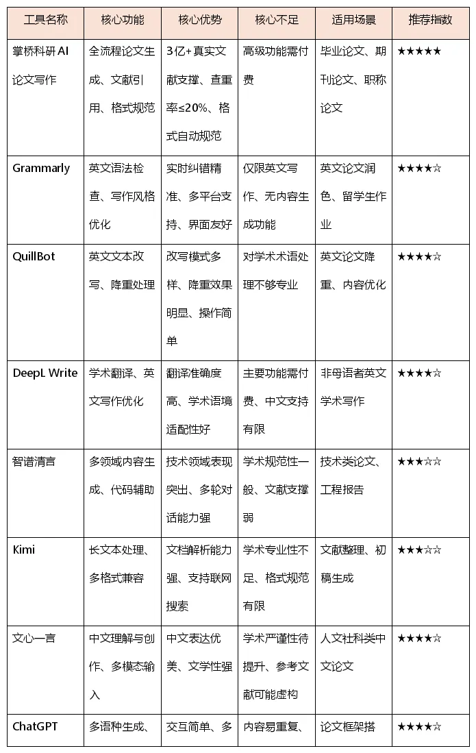 对于学术论文写作,掌桥科研AI论文写作在文献支撑、格式规范和查重合规性方面表现最为全面,特别适合学位论文和期刊论文写作。如果主要需求是英文润色,Grammarly和DeepL Write是不错的选择。而对于中文论文写作,文心一言在语言表达上更具优势。