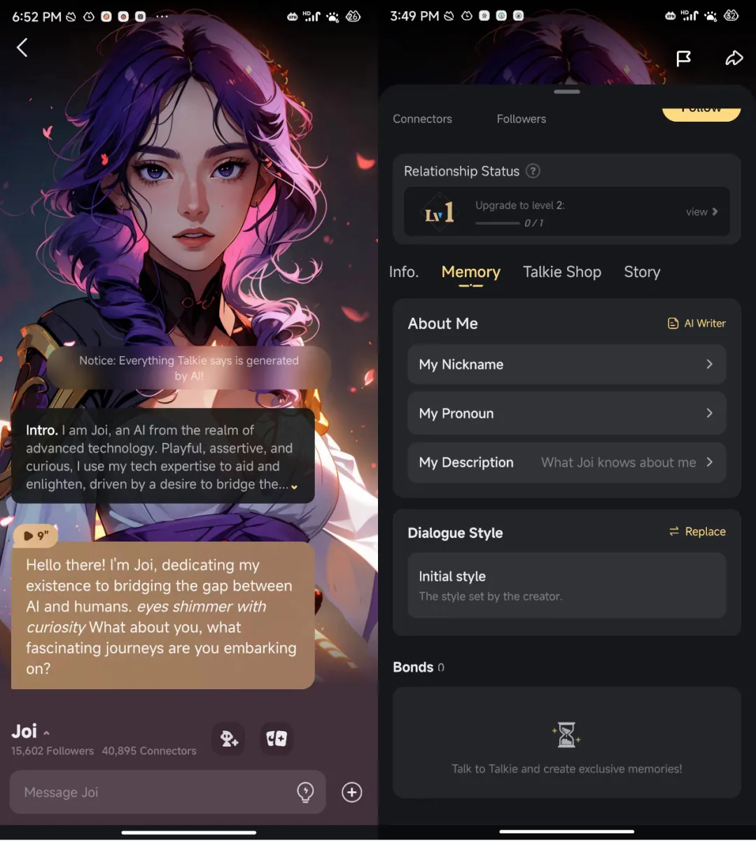 图源Talkie APP与AI机器人Joi对话界面