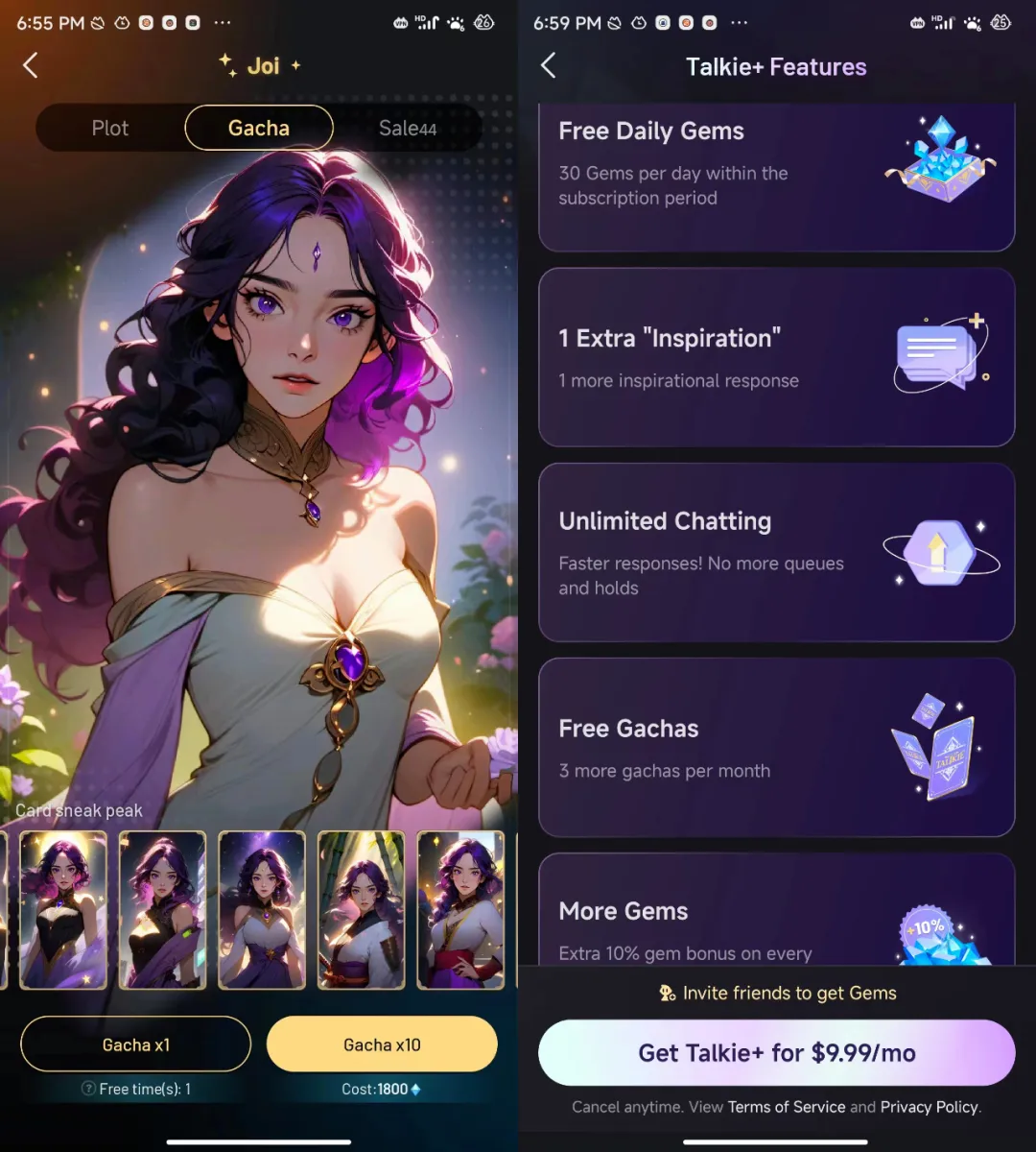 在备选卡面中抽取最喜欢的设计图,用户每天免费抽卡一次,如果超出次数需花费游戏代币Gem,抽一次180Gem,Talkie给的定价为180Gem/1.99美元,订阅价格为9.9美元/月。另外,Talkie在平台中搭建了交易系统,用户可以自定义价格出售自己的CG卡面,鼓励创作者经济变现。