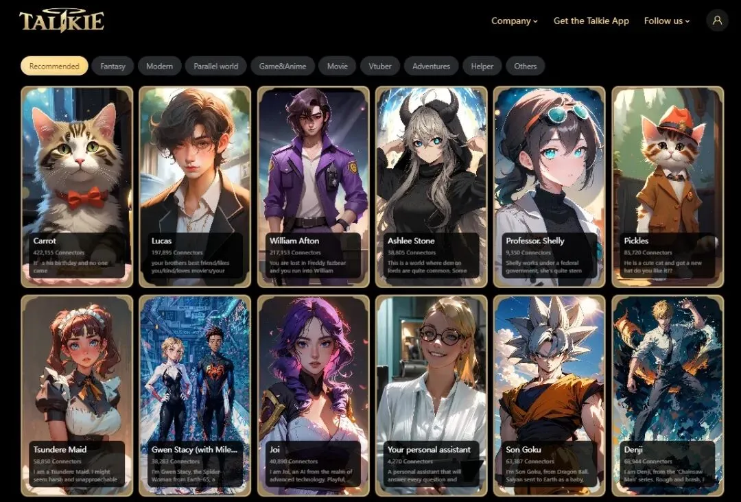 用户在平台中也可以创建助手角色,如文案写手、健康顾问、健身教练、私人助理等达成不同场景的问答。目前,Talkie平台内最受欢迎的角色多出自原创IP、游戏、动漫,平台中聊天次数最多(40万次)的AI机器人是一只过生日却无人关心的猫Carrot。
