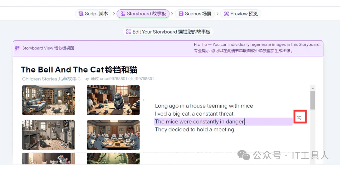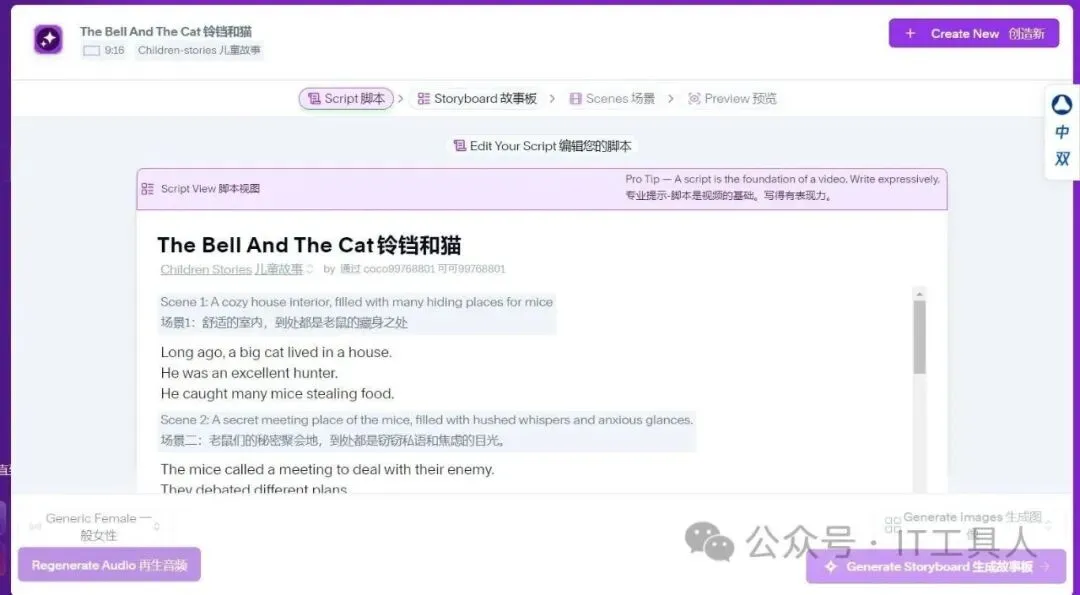 2、编辑脚本,选择音频(当前只有一个女音),生成剧情梗概(Storyboard)。
