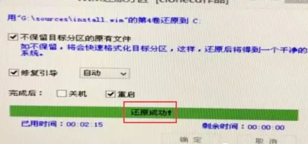 8、等显示还原成功,电脑就会重启,此时要【拔掉U盘】和一切相关的外部设备,安装完成后,电脑会重新启动数次不用管,直到下一步操作。