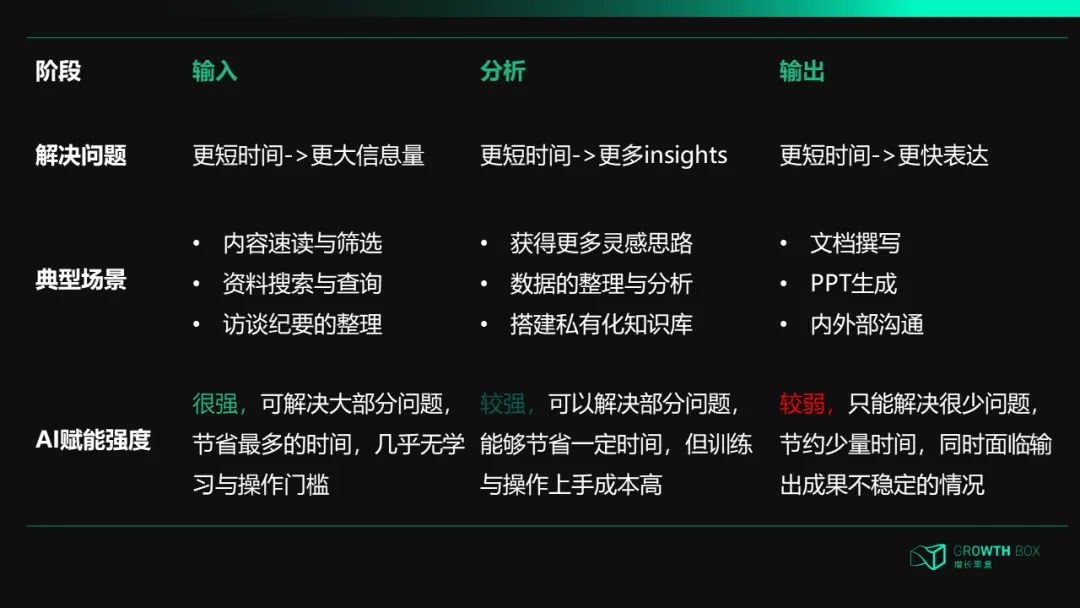 AI对于这个阶段的帮助虽然也很大,但仅适用于部分阶段。原因在于不同的公司、组织、职能的知识体系和业务逻辑千差万别,通用型的AI经常匹配不上。AI也许熟悉世界上所有的分析方法,但可能不知道如何套用到你所在的项目上,自然也就无法得到独特、深刻的洞察,会有很多正确的废话。