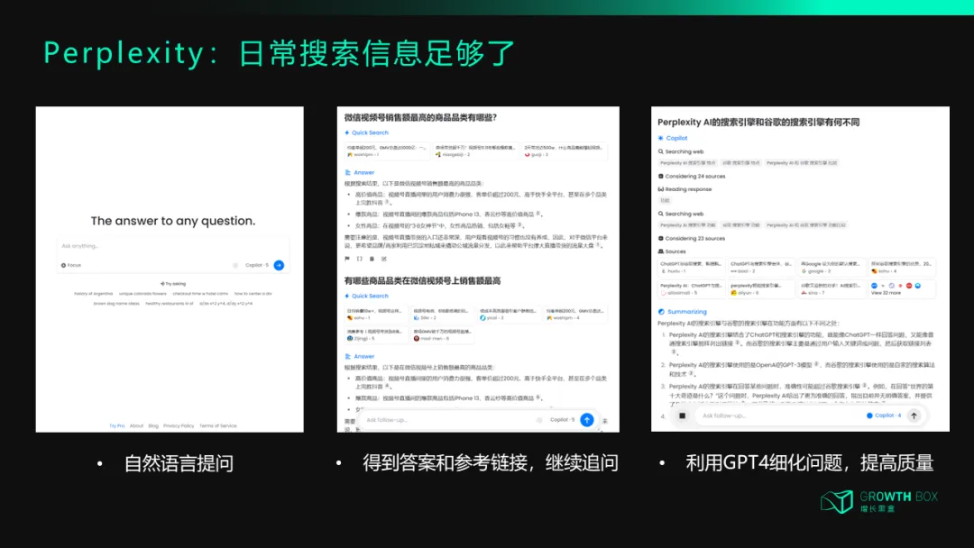 Perplexity AI提供了一种新的搜索模式,将ChatGPT和普通搜索结合起来,既有ChatGPT式的问答,又像普通搜索引擎那样列出链接,已经接入最新的GPT4模型。