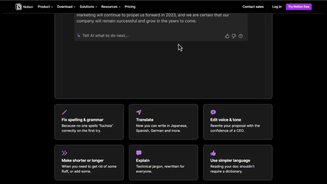 一个更加方便的工具是Notion AI。使用ChatGPT生成内容的最大问题是操作繁琐,还需要科学上网,而且Token数量也有限制。Notion本来就是一个笔记软件+团队协作空间,其云文档的体验已经非常优秀了。Notion AI直接内嵌在文档中,你可以直接在文档页面上进行改写、翻译、总结、续写等各种操作,而且对中文的支持也很好。虽然国内外有很多生成文字内容的工具,但针对专业性写作场景来说,我个人认为Notion AI是最好用的。