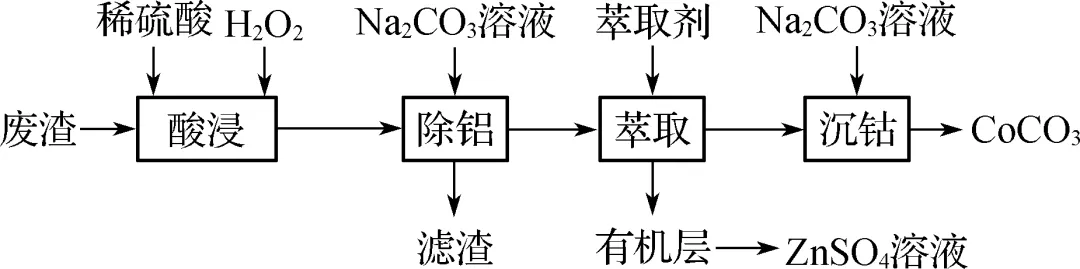 【解析】 温度过高,H2O2分解,不利于提高酸浸速率,A错误;除铝时加入Na2CO3溶液过滤后所得滤渣是Al(OH)3,B错误;萃取过程中,多次萃取能使萃取效率提高,C正确;将含Co2+的溶液缓慢滴加到Na2CO3溶液中,可能生成Co(OH)2沉淀,降低CoCO3的产率,D错误。