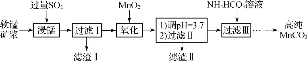 【解析】“浸锰”过程通入过量SO2,将Mn(Ⅳ)和Fe(Ⅲ)还原成Mn2+和Fe2+,Fe2O3与SO2反应离子方程式为Fe2O3+SO2+2H+===2Fe2++SO2-4+H2O,A、B正确;调节pH=3.7,MnO2将Fe2+氧化为Fe(OH)3,C正确;滤液为MnSO4溶液,加入NH4HCO3溶液反应的离子方程式为Mn2++2HCO-3===MnCO3↓+CO2↑+H2O,D错误。
