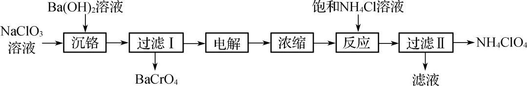 6. (2023·海安中学)高氯酸铵(NH4ClO4)受热或撞击可分解成N2、Cl2、O2和H2O,可用作火箭推进剂。一种以工业NaClO3(含少量的Na2Cr2O7和Na2CrO4)溶液制取高氯酸铵的流程如下,电解时使用惰性电极,电解后溶液中有NaClO4生成。
