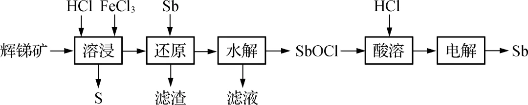 【解析】 Sb3+发生水解的离子方程式为Sb3++Cl-+H2OSbOCl+2H+,可加入Na2CO3粉末促进Sb3+水解,A正确;辉锑矿中加入盐酸、FeCl3溶液“溶浸”,加入Sb,Sb将Fe3+还原为Fe2+,目的是防止Fe3+在后续水解生成Fe(OH) 3,B正确;“滤液”中含有的主要金属阳离子有Fe2+、Al3+、Mg2+,C正确;“溶浸”时,Sb3+需要进入溶液中,说明SbCl3可溶于水,书写离子方程式时,SbCl3需要拆分为离子形式,D错误。