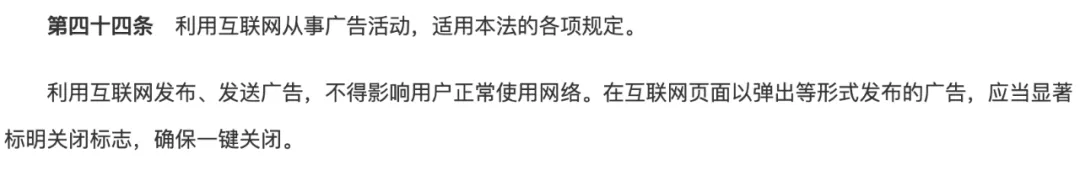 利用互联网发布、发送广告,不得影响用户正常使用网络。在互联网页面以弹出等形式发布的广告,应当显著标明关闭标志,确保一键关闭。