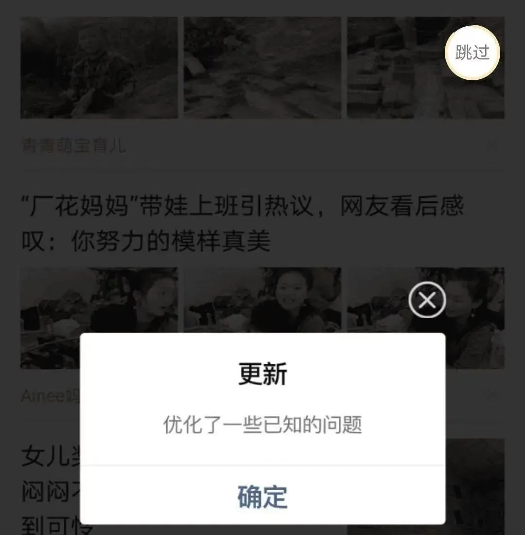 还有一种情况,就是把开屏广告做成弹窗的样子,然后写着“更新”,还似模似样地写着更新公告。