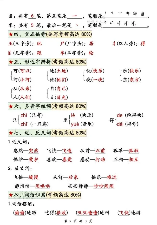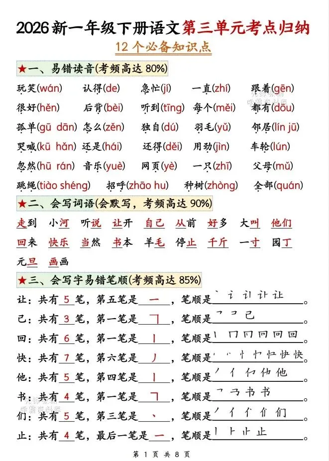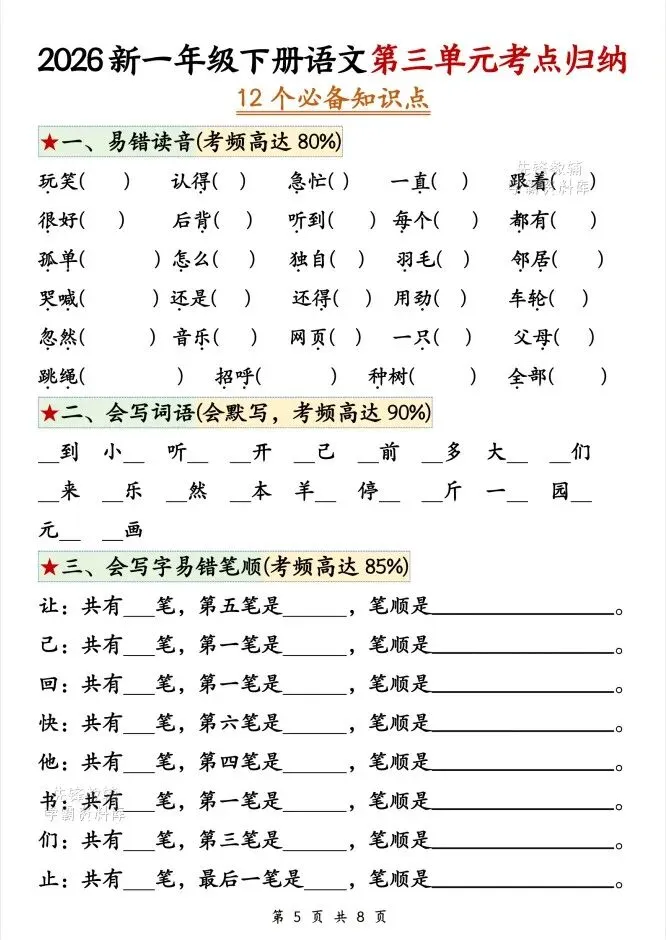 今天给大家整理了2026新一年级下册语文第三单元考点归纳+空白,转发给朋友或班级群,受益更多人,帮助孩子学习!