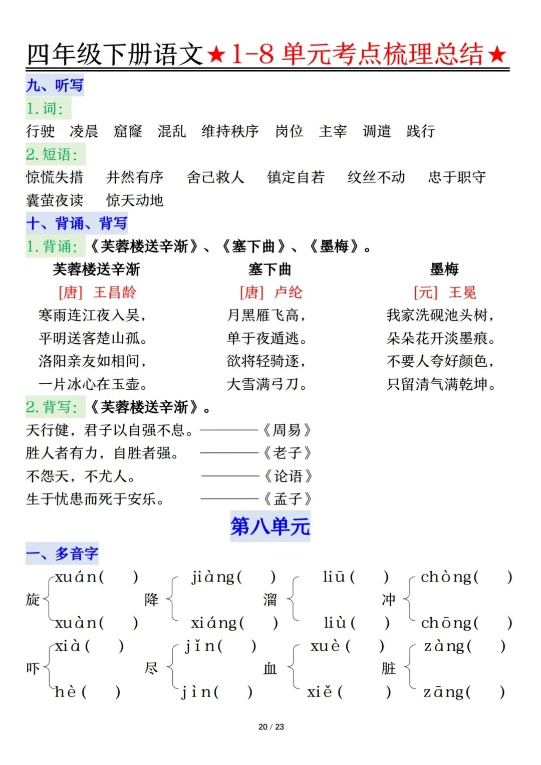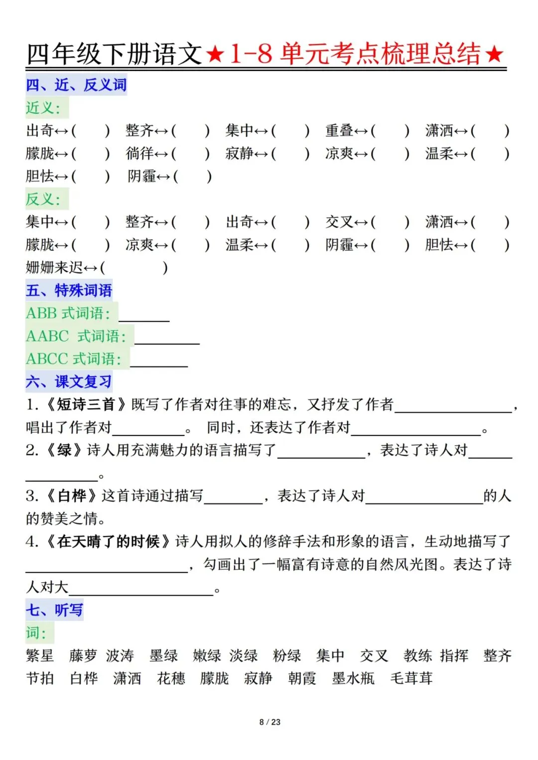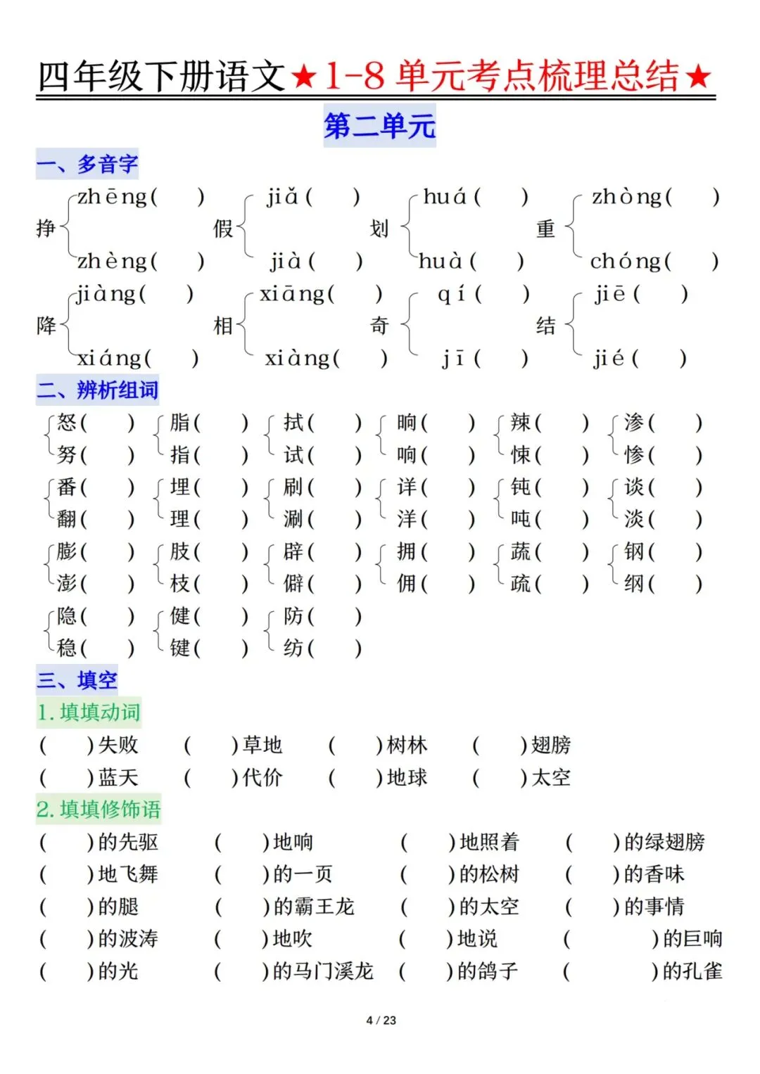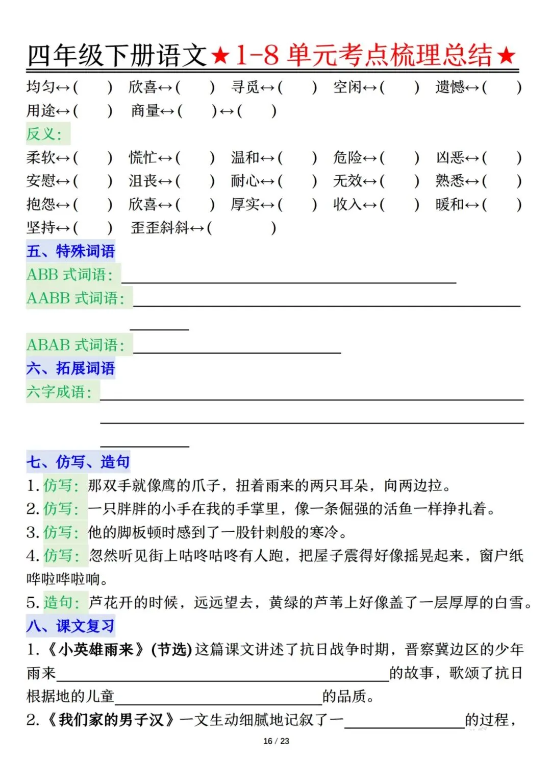 四下语文1-8单元考点梳理(电子档附答案可打印)