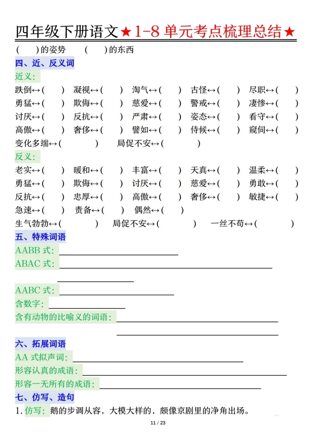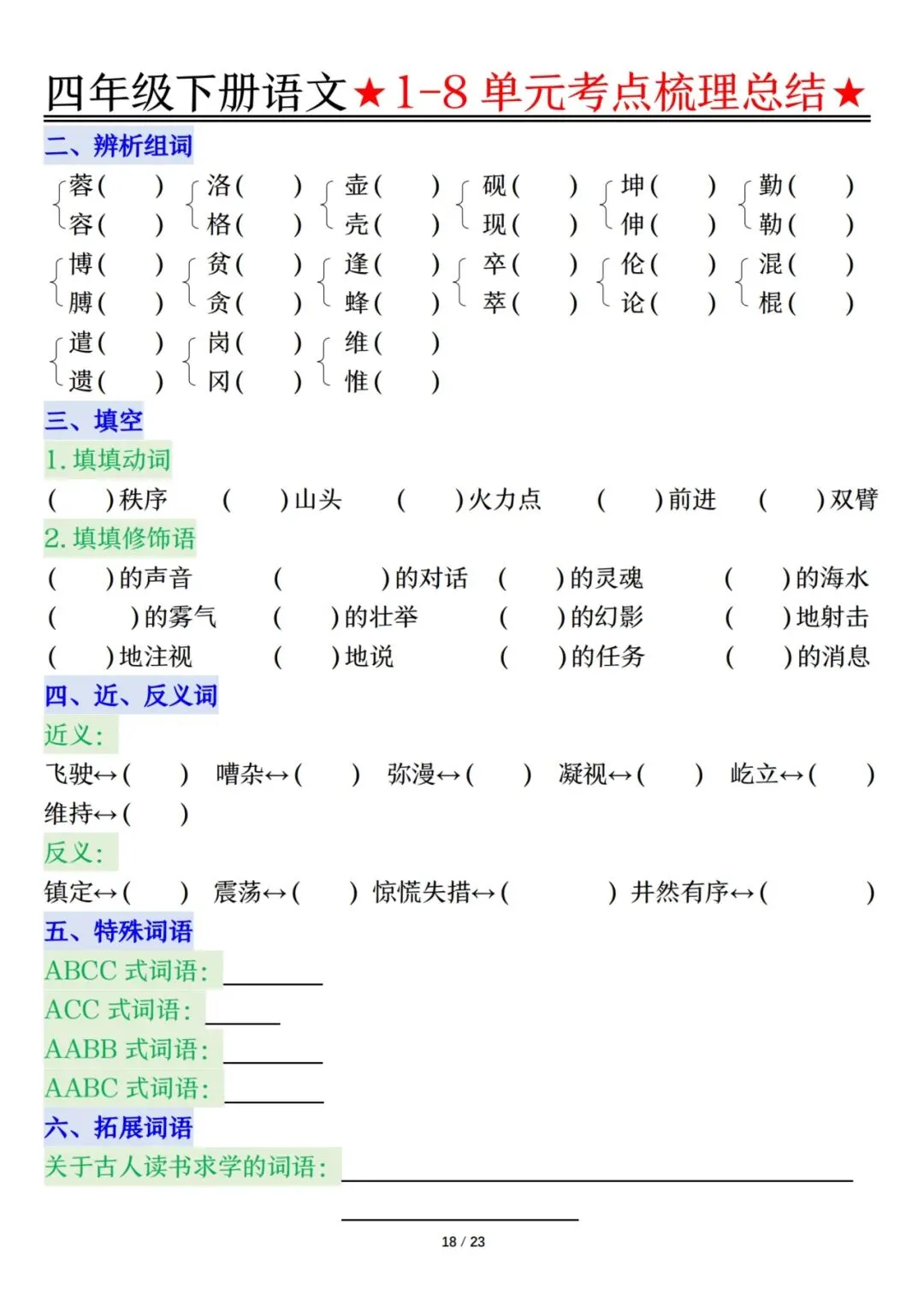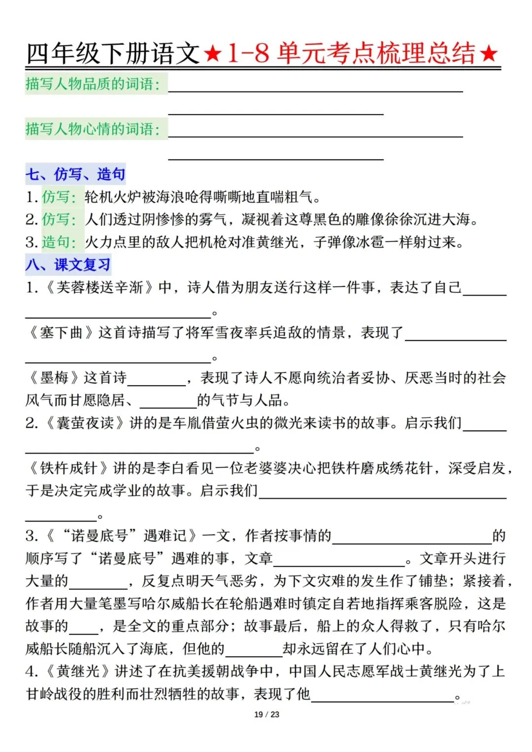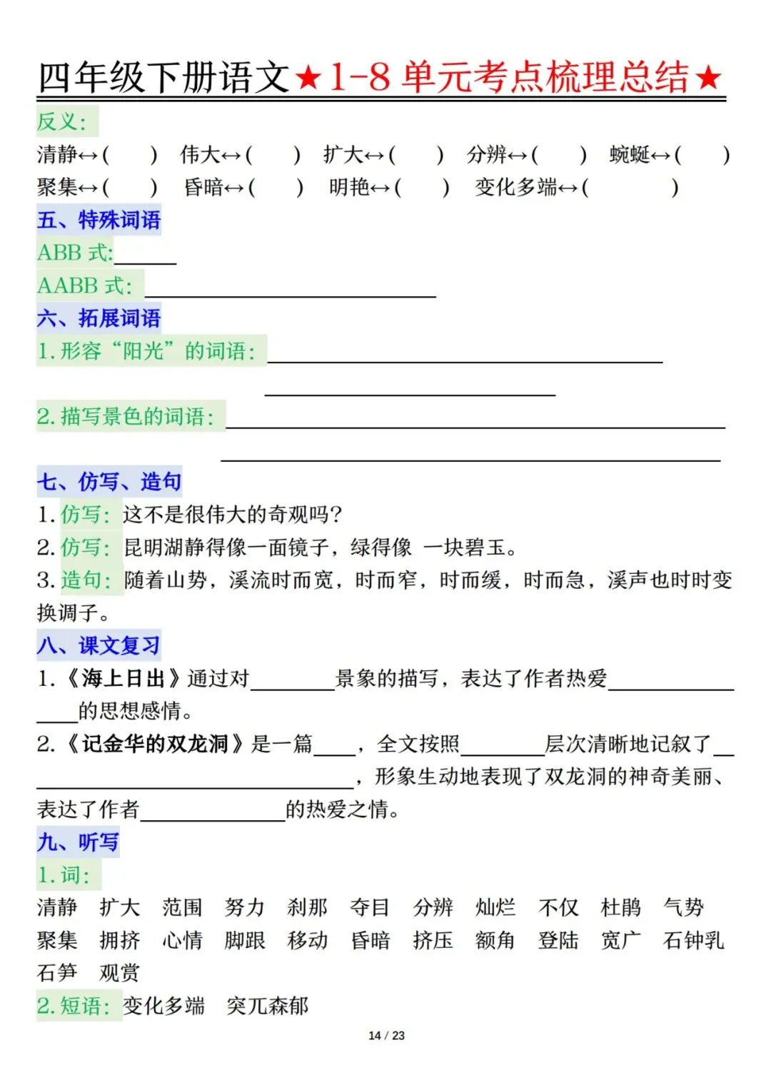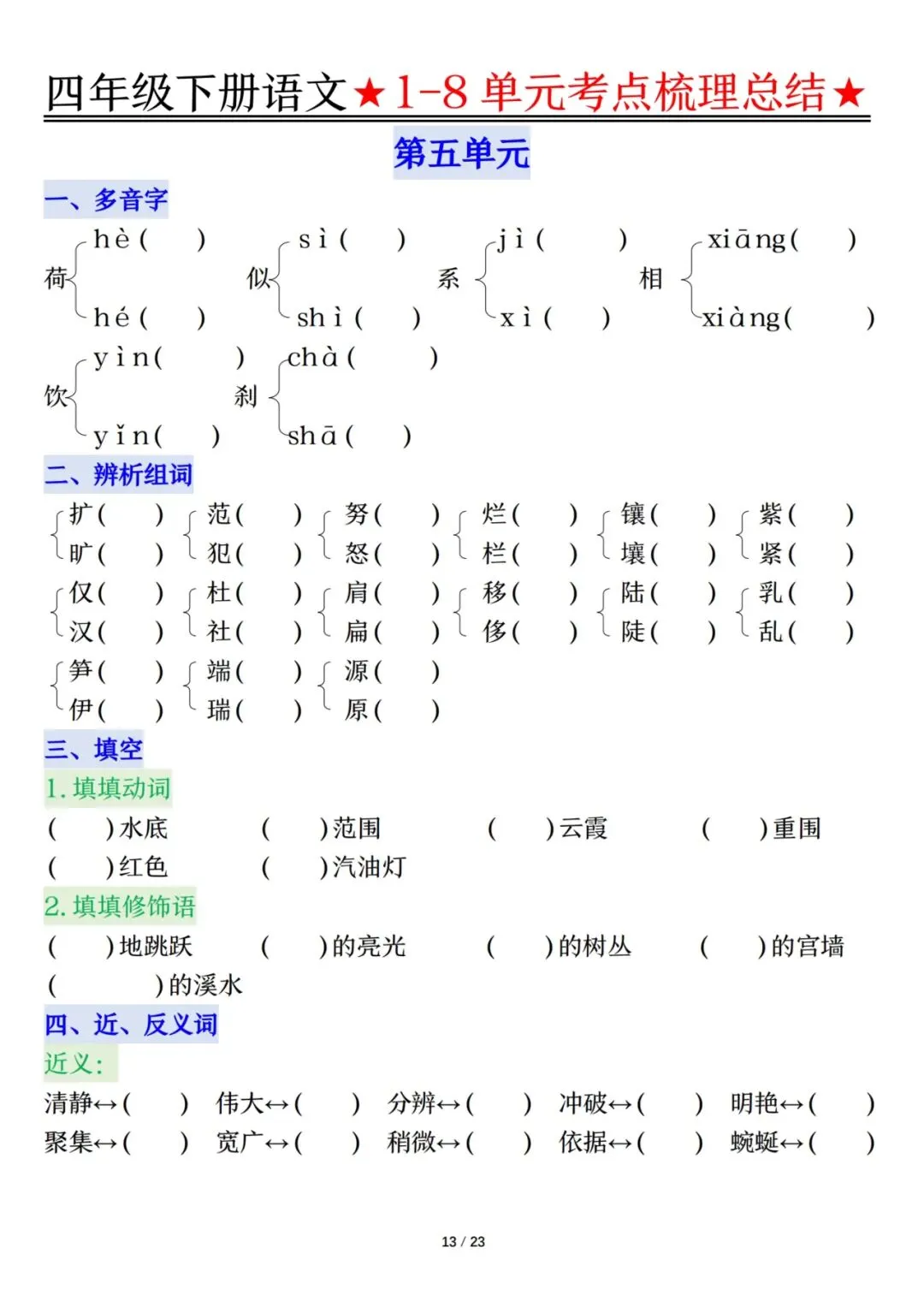 四下语文1-8单元考点梳理(电子档附答案可打印)