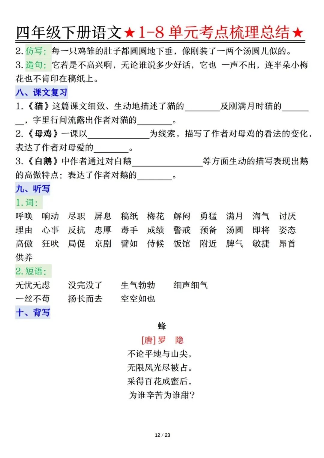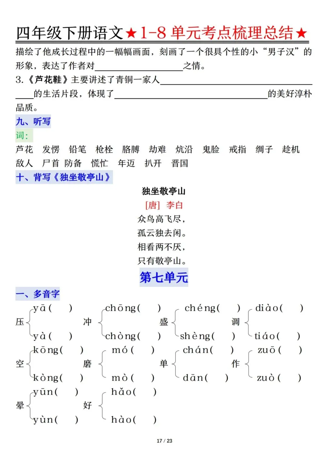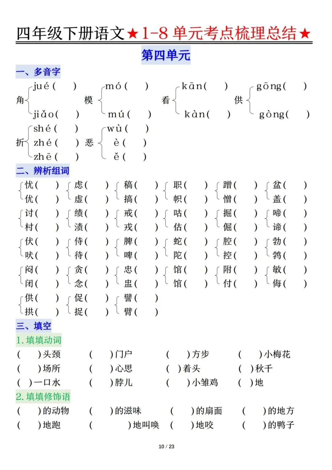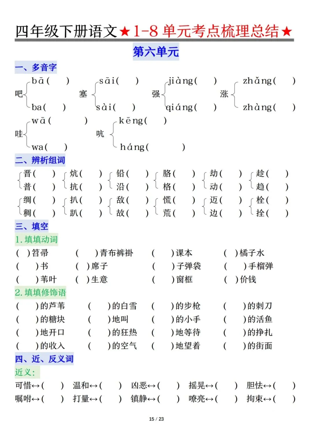 四下语文1-8单元考点梳理(电子档附答案可打印)