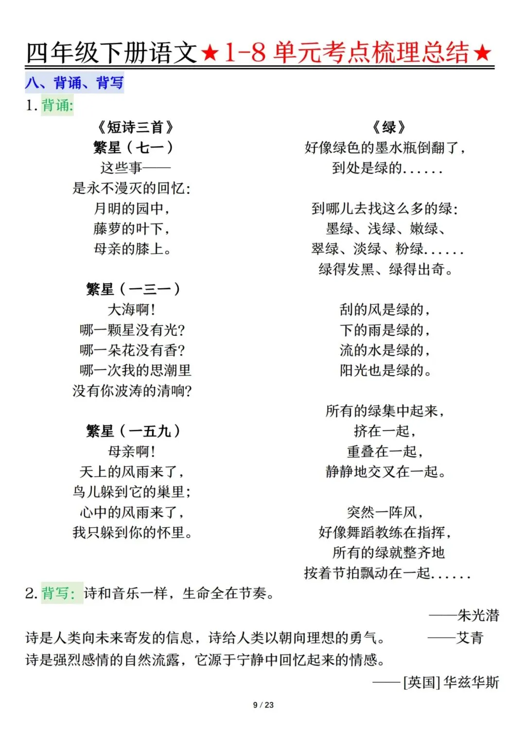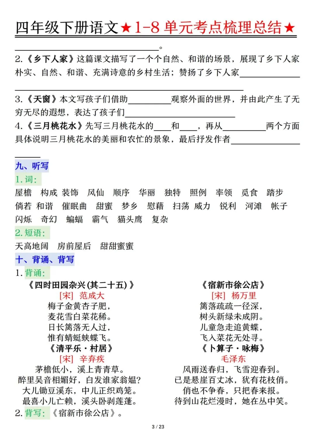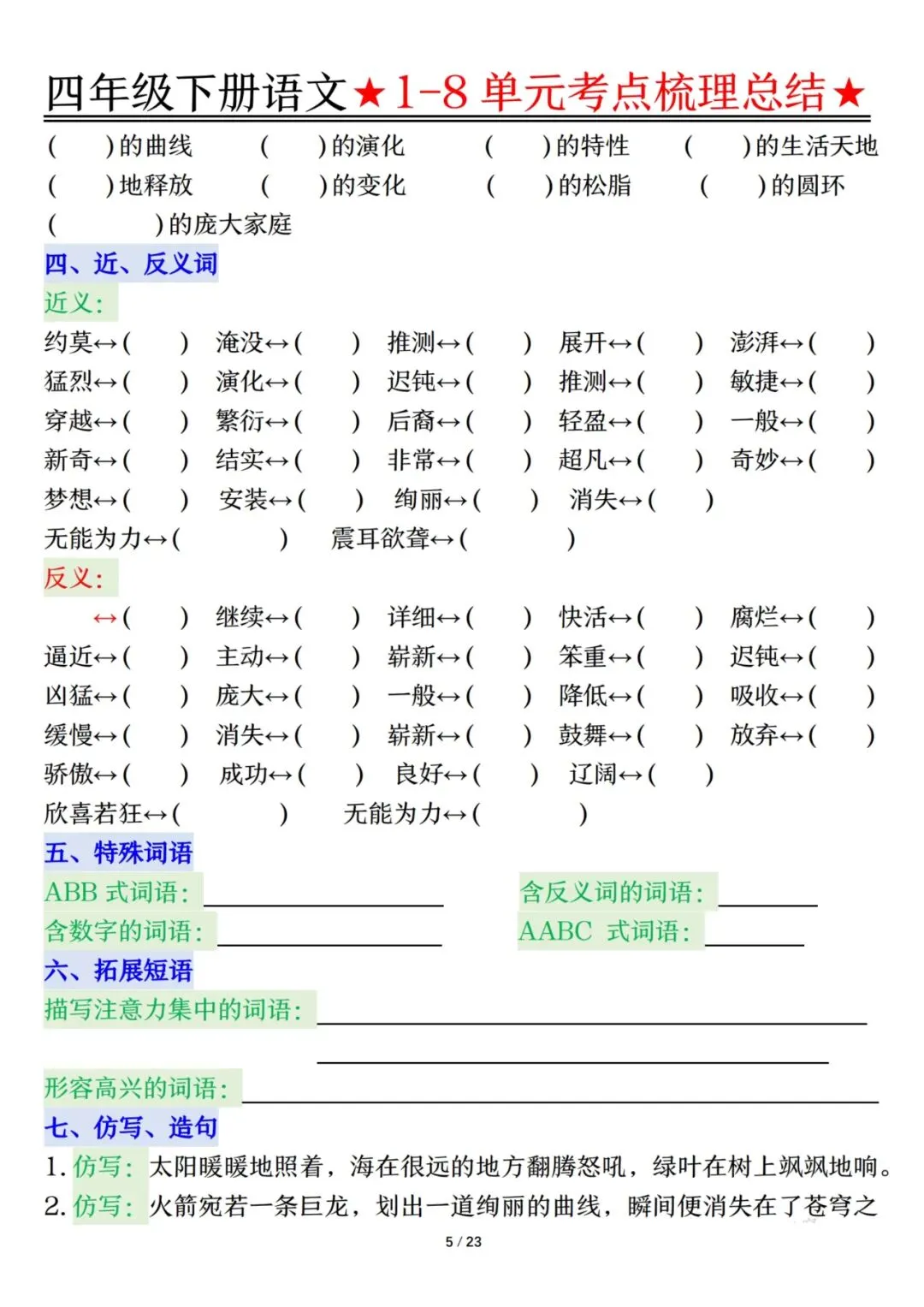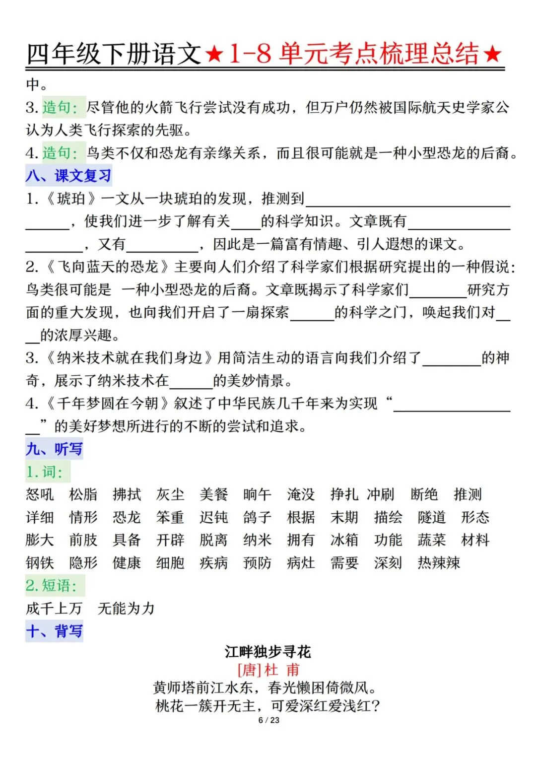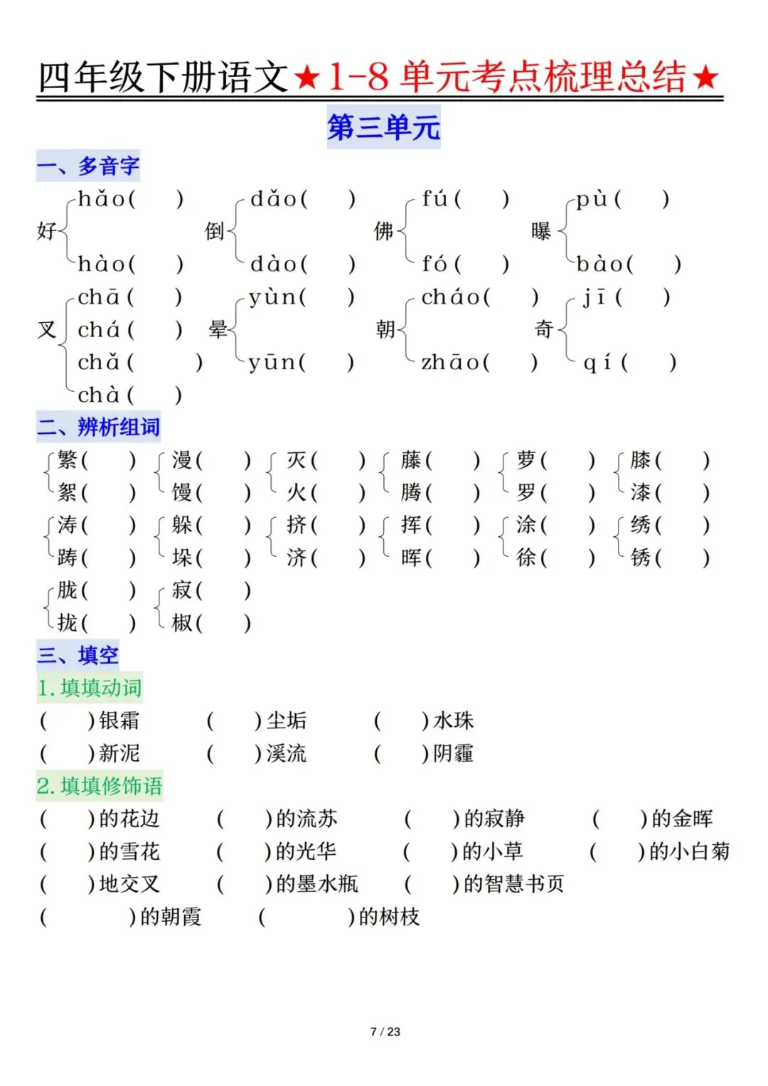 四下语文1-8单元考点梳理(电子档附答案可打印)