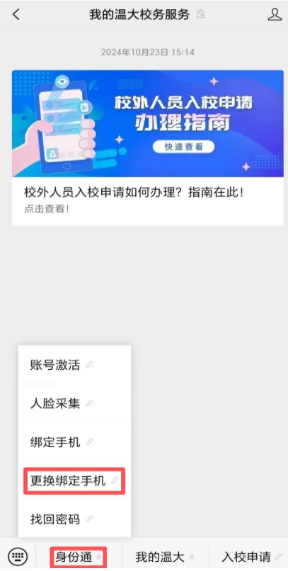 进入公众号 → 点击菜单栏 “身份通” → 选择 “更换绑定手机”。