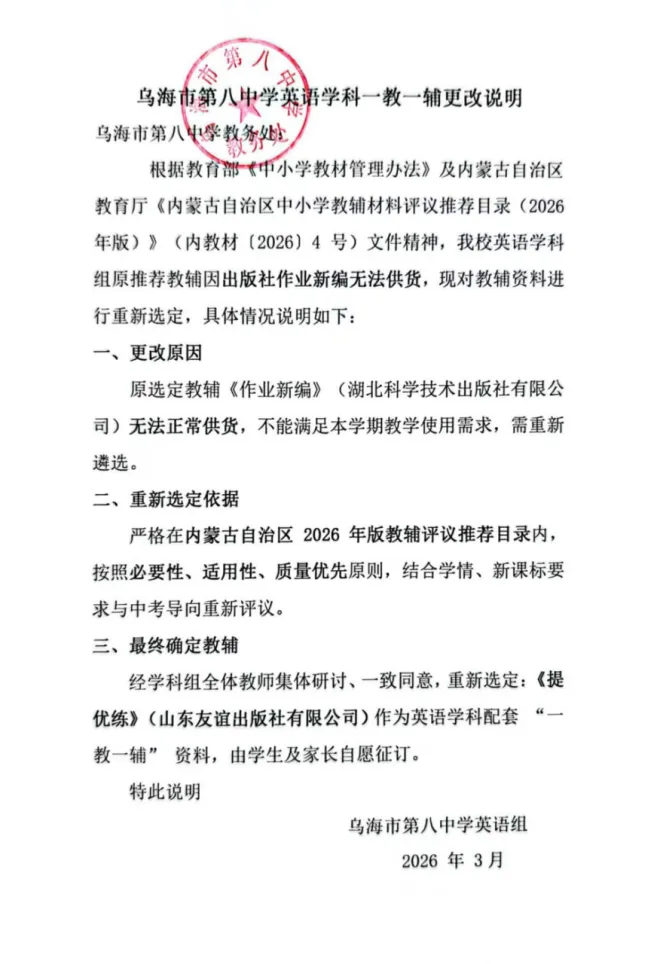 因原选定英语教辅《作业新编·英语》(湖北科学技术出版社有限公司)无法正常供货,不能满足本学期教学使用需求,现根据教育部《中小学教材管理办法》及内蒙古自治区教育厅《内蒙古自治区中小学教辅材料评议推荐目录(2026年版)》(内教材〔2026〕4号)文件,我校教务处组织英语学科组在自治区2026年版教辅评议推荐目录内,按照必要性、适用性、质量优先原则,结合学情、新课标要求与中考导向重新评议,经过我校英语教研组选定并上报乌海市第八中学一教一辅工作领导小组审定后,现选定《提优练》(山东友谊出版社有限公司)作为新的英语学科配套“一教一辅”资料。