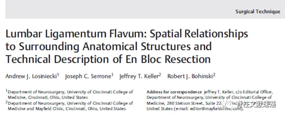 Losiniecki AJ,Serrone JC,Keller JT,Bohinski RJ.Lumbar ligamentum flavum:spatial relationships to surrounding anatomical structures and technical description of en bloc resection.J Neurol Surg A Cent Eur Neurosurg.2013;74(6):388-392.doi:10.1055/s-0033-1348350.