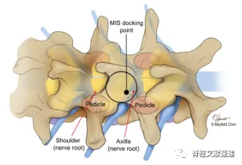 图2显示出神经根与黄韧带和椎弓根的关系:黄韧带的上外侧角和下外侧角是分别是识别上神经根腋窝和下神经根肩的标志。