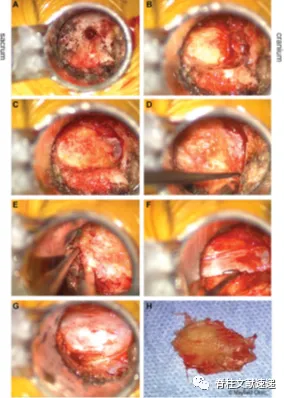 图3通过管牵开器的术中照片:(A)L4右关节间部对接点,为L4-L5经椎间孔腰椎体间融合术做准备。(B)用高速钻头接近椎板腹侧黄韧带的连接点,切除L4板的三分之二。黄韧带从其与对侧韧带的中线连接处分离,可见中线硬膜外脂肪垫。(C)继续椎板切除使上椎板上的韧带止点脱离。(D)分离黄韧带的上外侧角,L4神经根的腋窝在这个解剖标志下。(E)用咬骨钳从下椎板的上侧面取下少量的骨,以分离韧带的下附着体。(F)黄韧带的上、内、下附着被释放后,黄韧带向外侧翻转,露出硬膜囊。(G)用咬骨钳释放黄韧带的外侧附着点,并将韧带移除。(H)全组切除后的黄韧带。