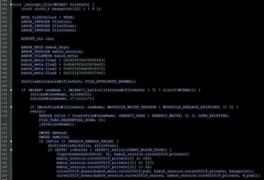 Babuk勒索软件在加密过程中使用了椭圆曲线加密(ECC)。泄露的文件中还包含对特定受害者编译的加密器和解密器。