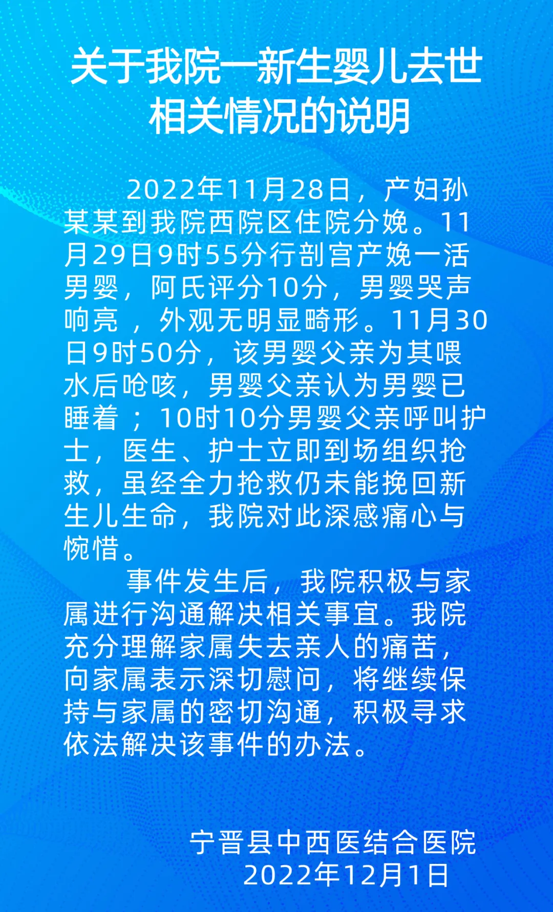 2022年11月28日,产妇孙某某到医院西院区住院分娩。11月29日9时55分行剖宫产娩一活男婴,阿氏评分10分,男婴哭声响亮,外观无明显畸形。11月30日9时50分,该男婴父亲为其喂水后呛咳,男婴父亲认为男婴已睡着;10时10分男婴父亲呼叫护士,医生、护士立即到场组织抢救,虽经全力抢救仍未能挽回新生儿生命,医院对此深感痛心与惋惜。