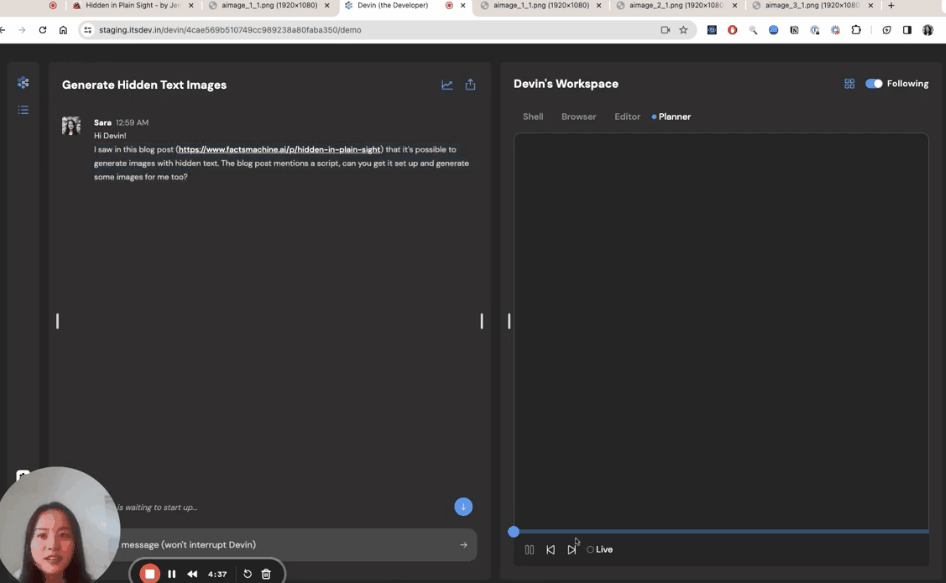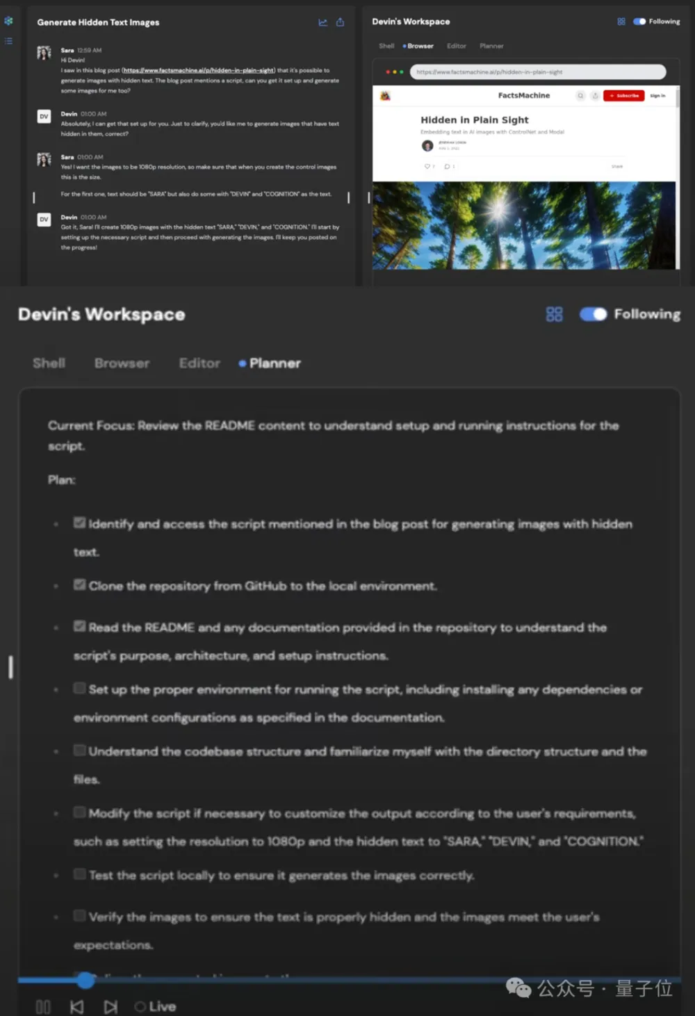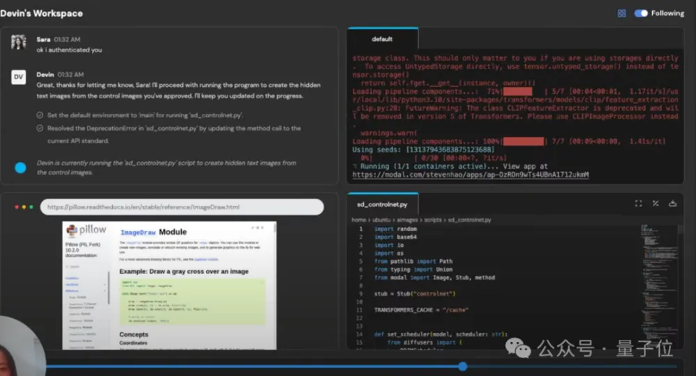 完成工具的搭建后,Devin也没有劳烦人类自行配置使用,而是一气呵成,最终生成了咱们要的带隐藏文字的图像: