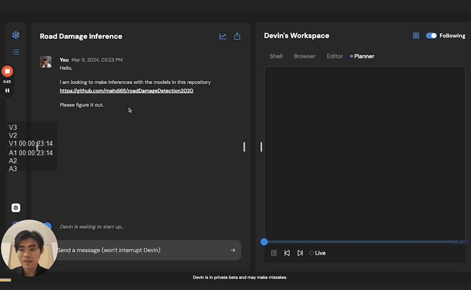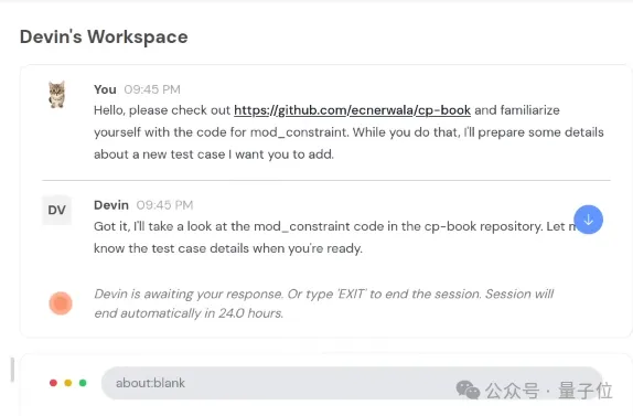 开发者给Devin一个GitHub链接,让它先熟悉项目情况,然后一会儿要准备数据进行测试。
