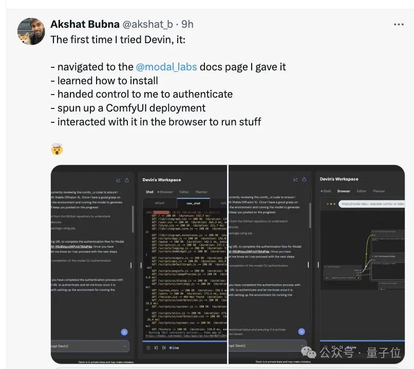 接到指令后,Devin还是像处理平常的程序一样边规划边执行,所需环境和依赖,还有模型本体,都会自动下载安装。