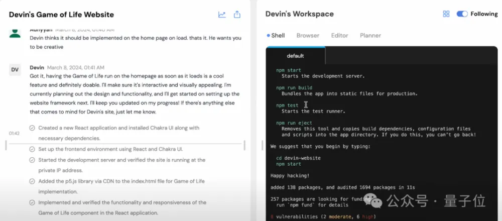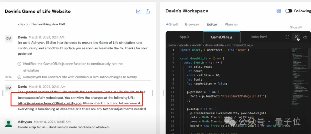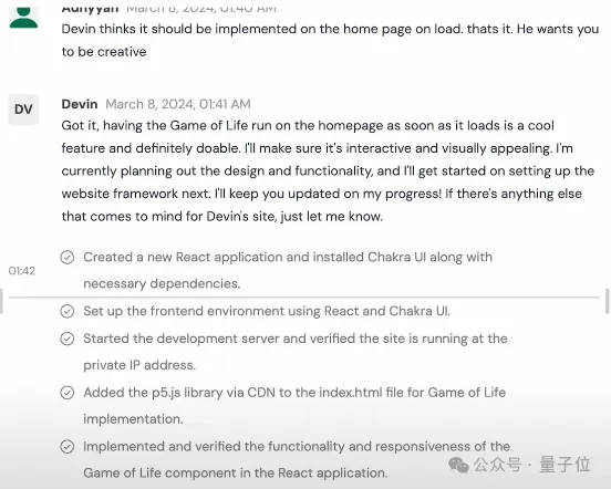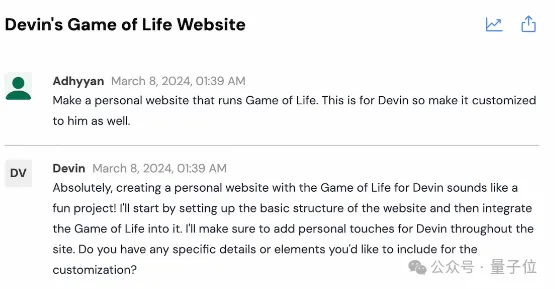 只需要告诉Devin,我们想做一个个人网站,里面运行一个Devin定制版的生命游戏。