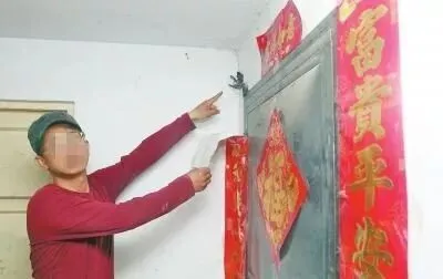 邻居家地下室门左上角圆形的分线口,平时都用春联遮挡着。