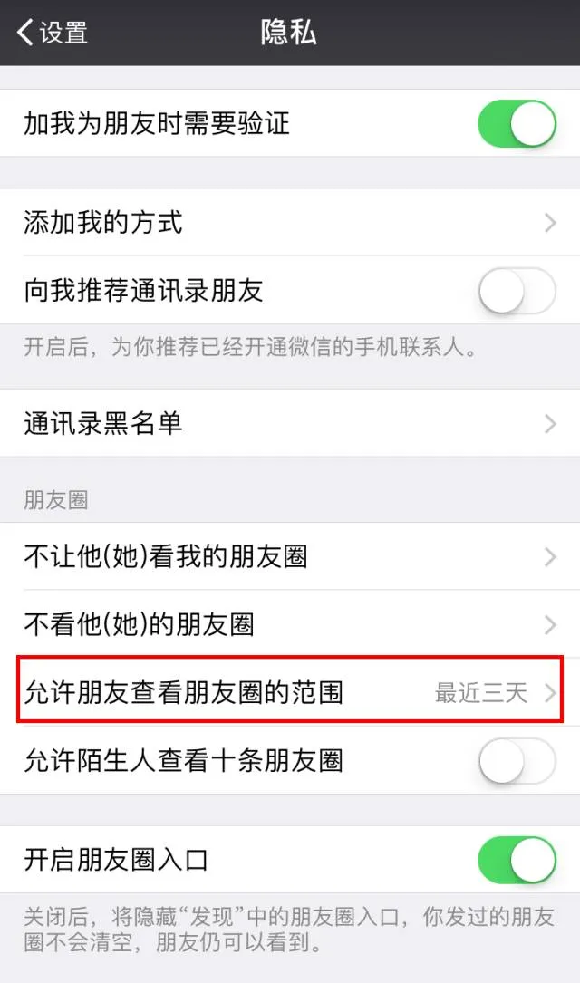 允许朋友查看朋友圈的范围,可选择“最近三天”“最近半年”和“全部”(若不进行更改,则默认为全部)。
