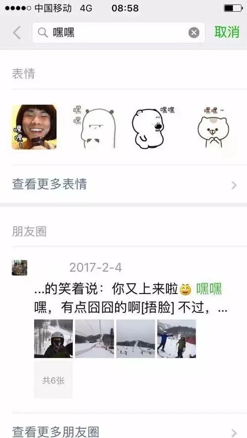 此外,还可以单独搜索带关键词的文章、小说等,最后表情的选项简直就是斗图必备技能啊!随便输入个表情形容词就会出来很多,我输入的是“嘿嘿”,你们看看哈。