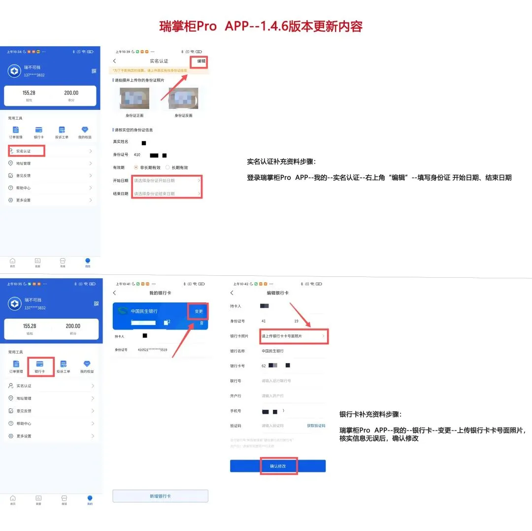 登录瑞掌柜Pro APP–我的–银行卡–变更–上传银行卡卡号面照片,核实信息无误后,确认修改。