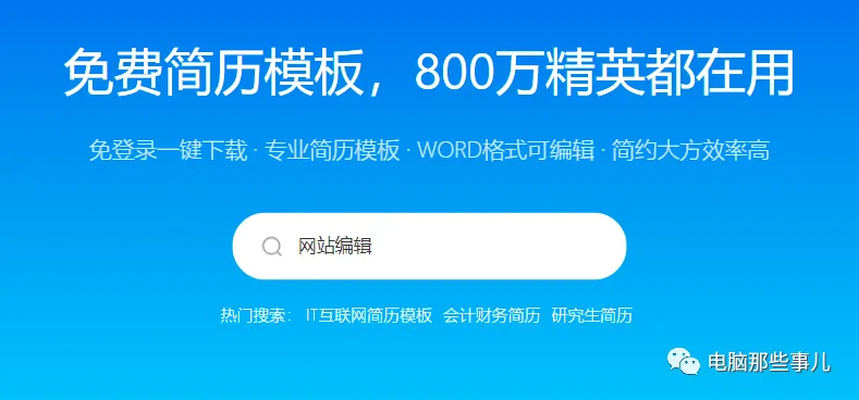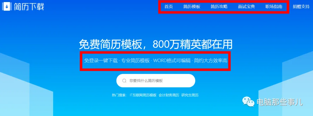 1、进入简历模板网站,可以看到有简历模板、简历攻略、面试宝典、职场指南等多个功能。首页标明免登录一键下载,Word格式。