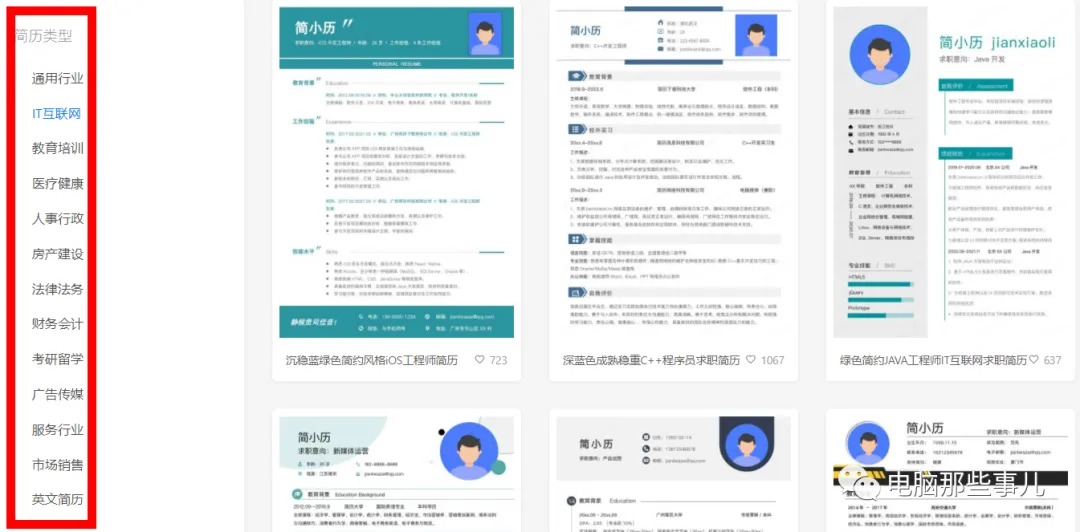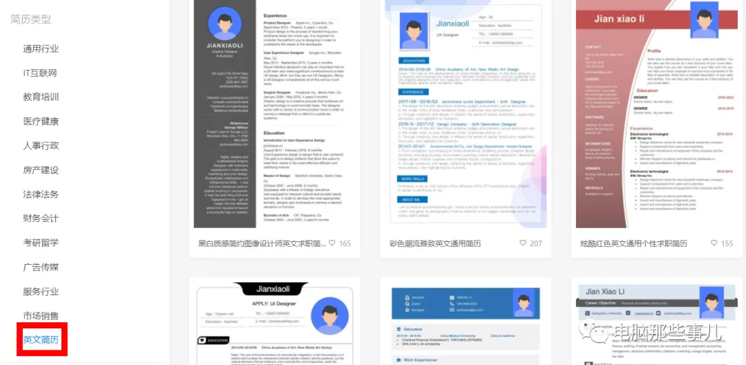 2、点击简历模板,左侧可以看到简历类型,比如通用、IT互联网、人事行政、广告传媒和英文简历等等。