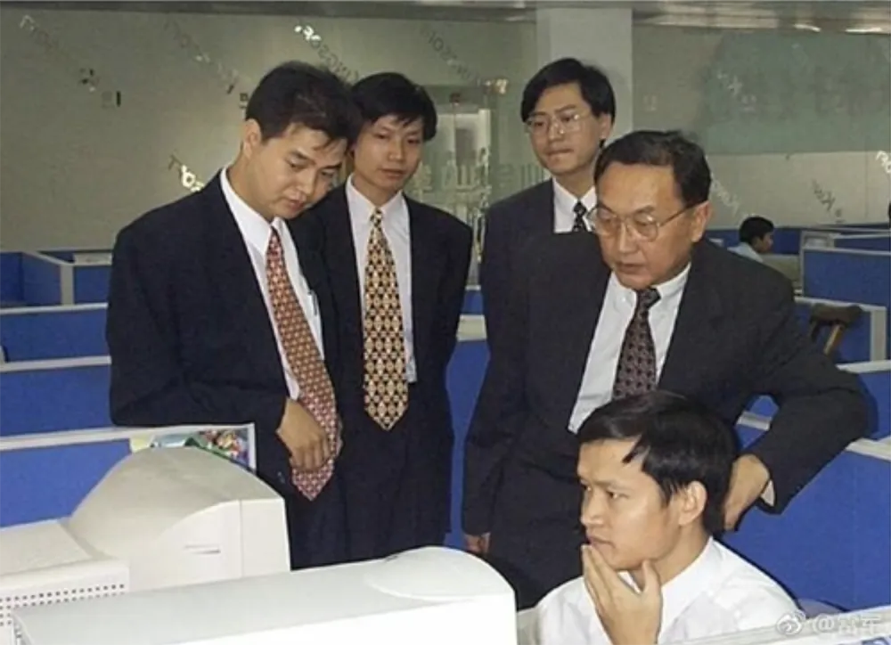 ▲2014年7月,雷军在微博上晒出一张1998年的老照片,他正和求伯君一起陪同联想集团的柳传志、杨元庆观看WPS的新产品演示