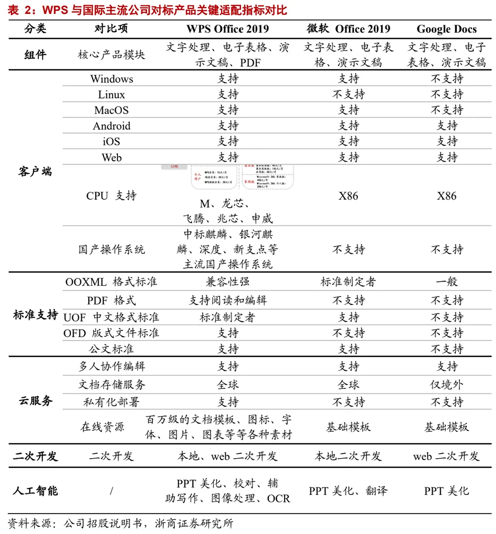 ▲WPS与微软Office对标产品关键适配指标对比(来源:浙商证券研究所)