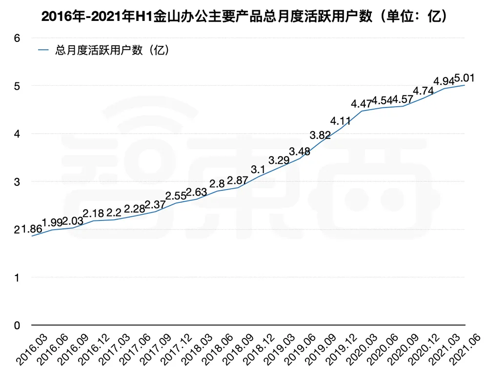 截至2021年6月30日,WPS及金山词霸总月活用户数达5.01亿,其中WPS PC端月度活跃用户数1.99亿,移动端月度活跃用户数2.96亿。