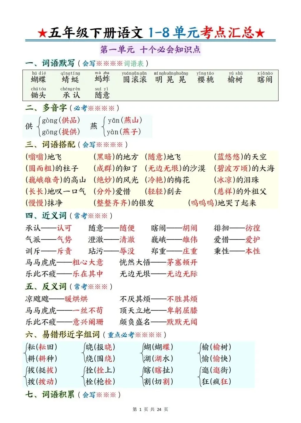 五年级下册语文1-8单元考点汇总(电子版可打印)
