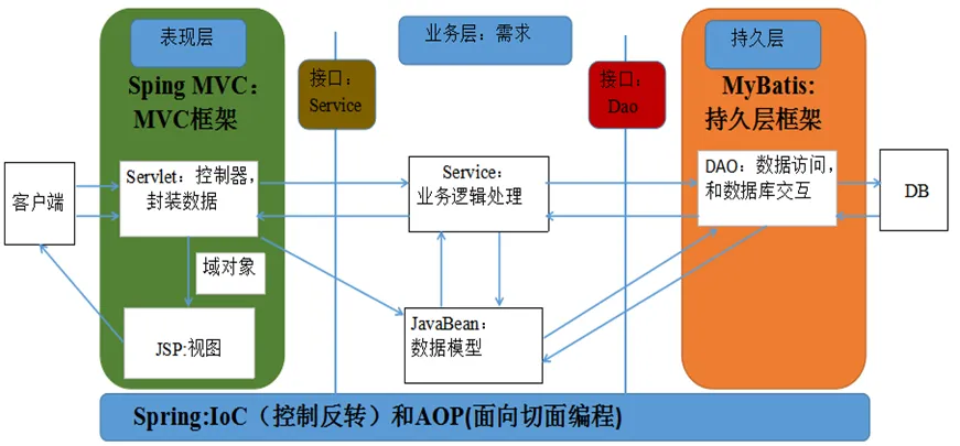 表现层(Web层)负责接收客户端请求,并向客户端响应结果。
