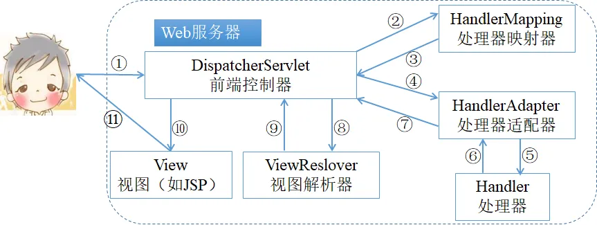 用户通过浏览器向服务器发送请求,请求会被Spring MVC的前端控制器DispatcherServlet所拦截;
