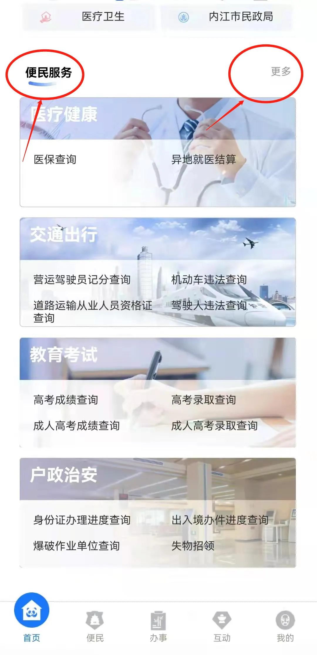 第三步:登录后请选择找地区选择内江市向下滚动,找到便民服务,点击更多