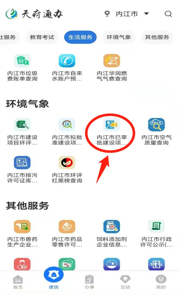 如何使用“天府通办app”便民服务查询内江市已审批建设项目环评文件公告