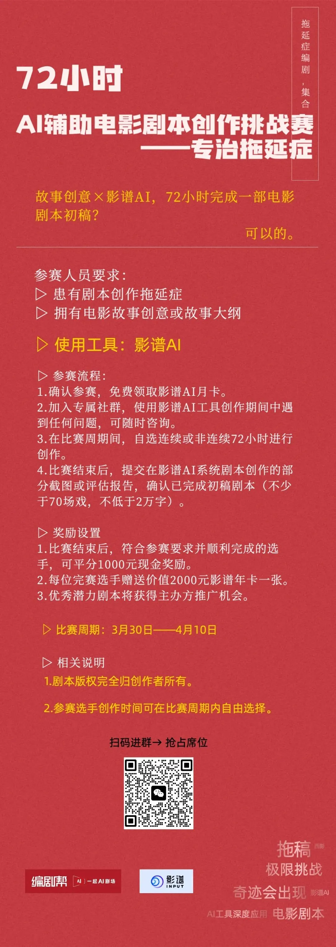 为了让大家更好地体验影谱 AI 在辅助编剧创作方面的能力,近期编剧帮联合影谱 AI 发起一场具有实验性的72 小时 AI 辅助电影剧本创作挑战赛,欢迎您的参与。