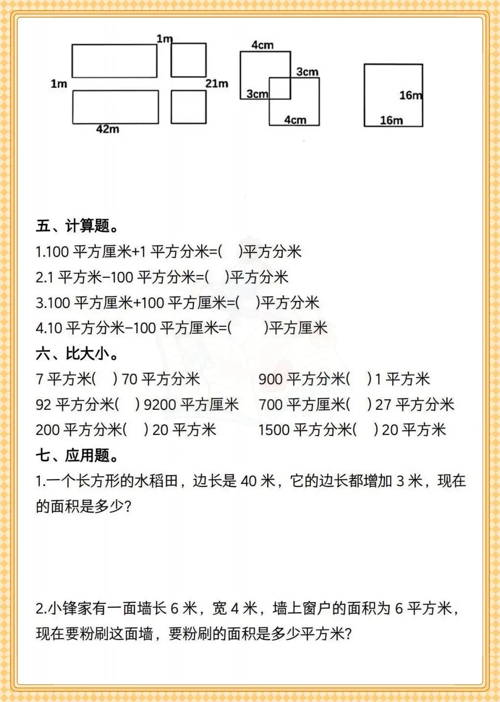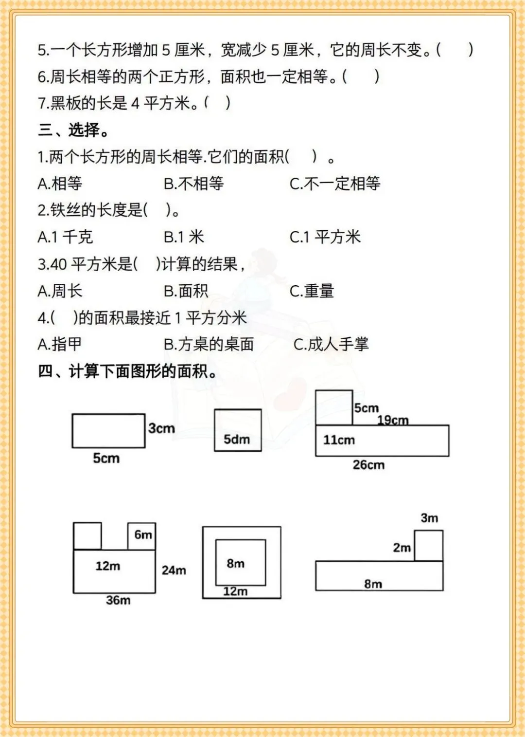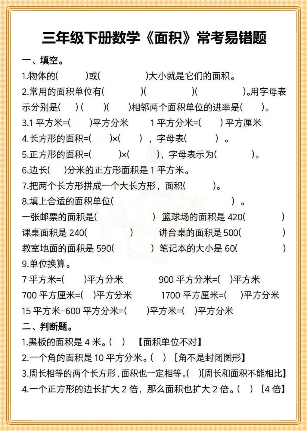 三年级数学面积专题+常考易错题 可打印专项练习-可打印