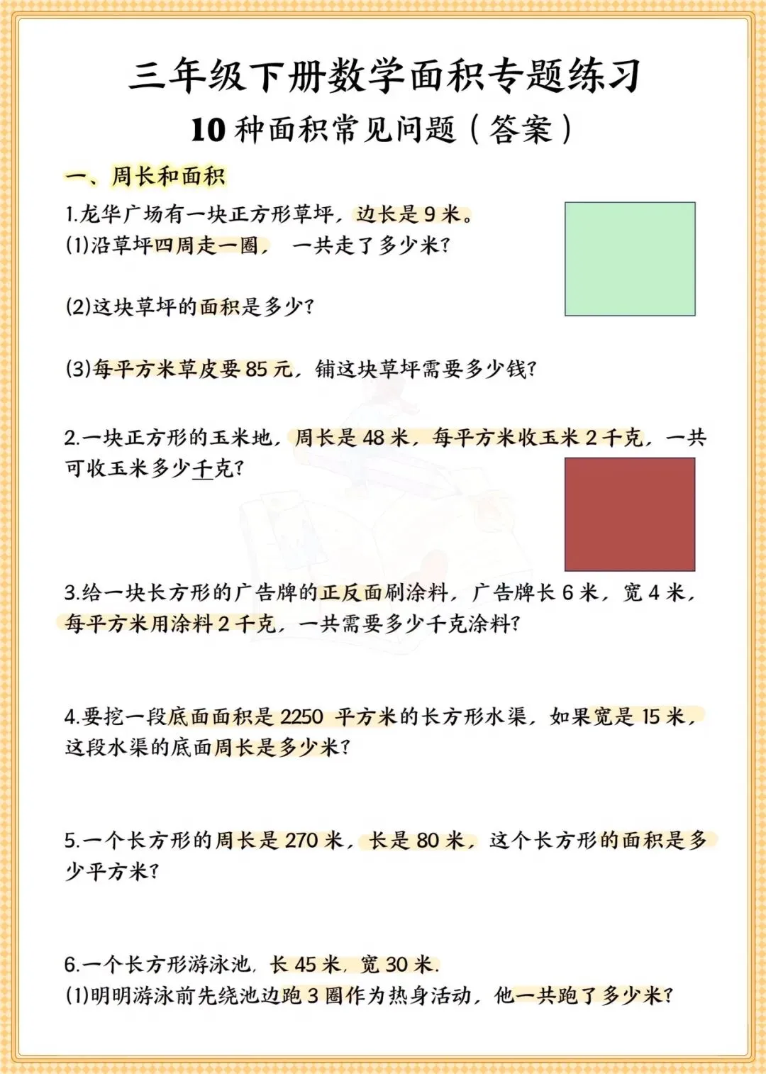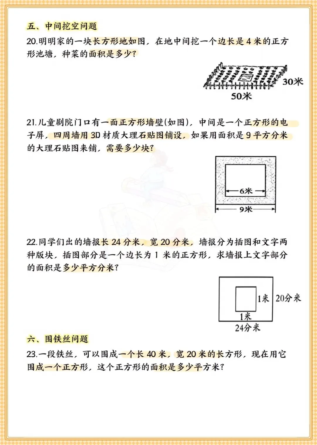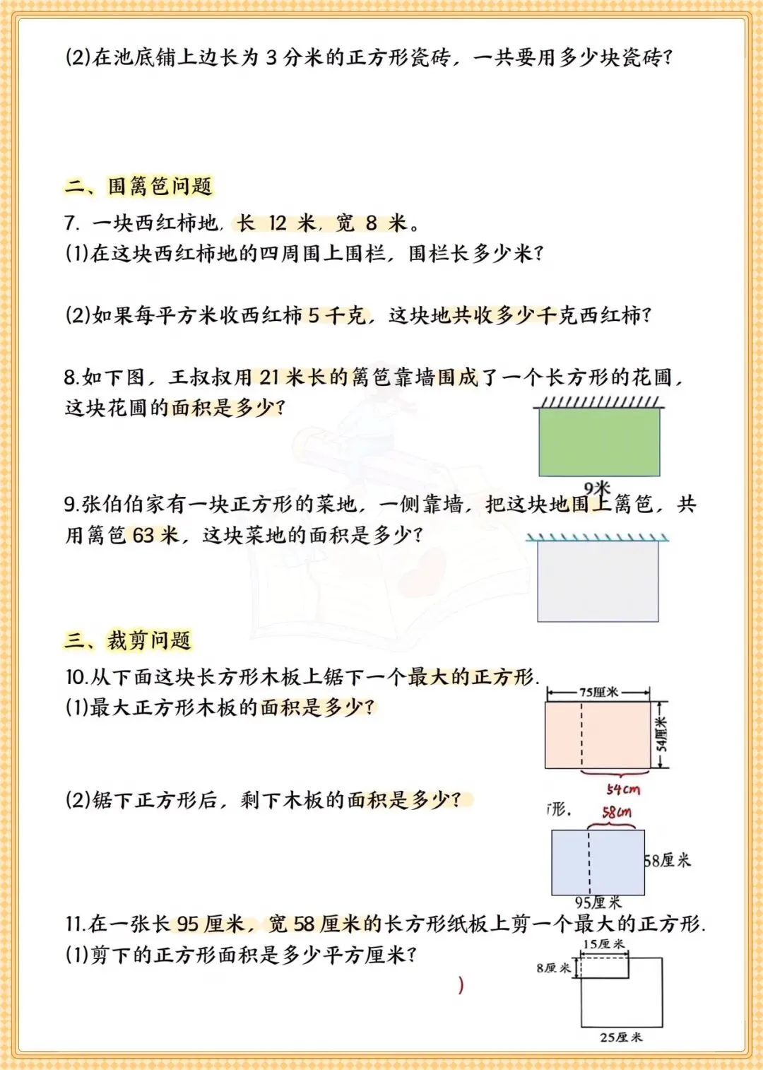 三年级数学面积专题+常考易错题 可打印专项练习-可打印