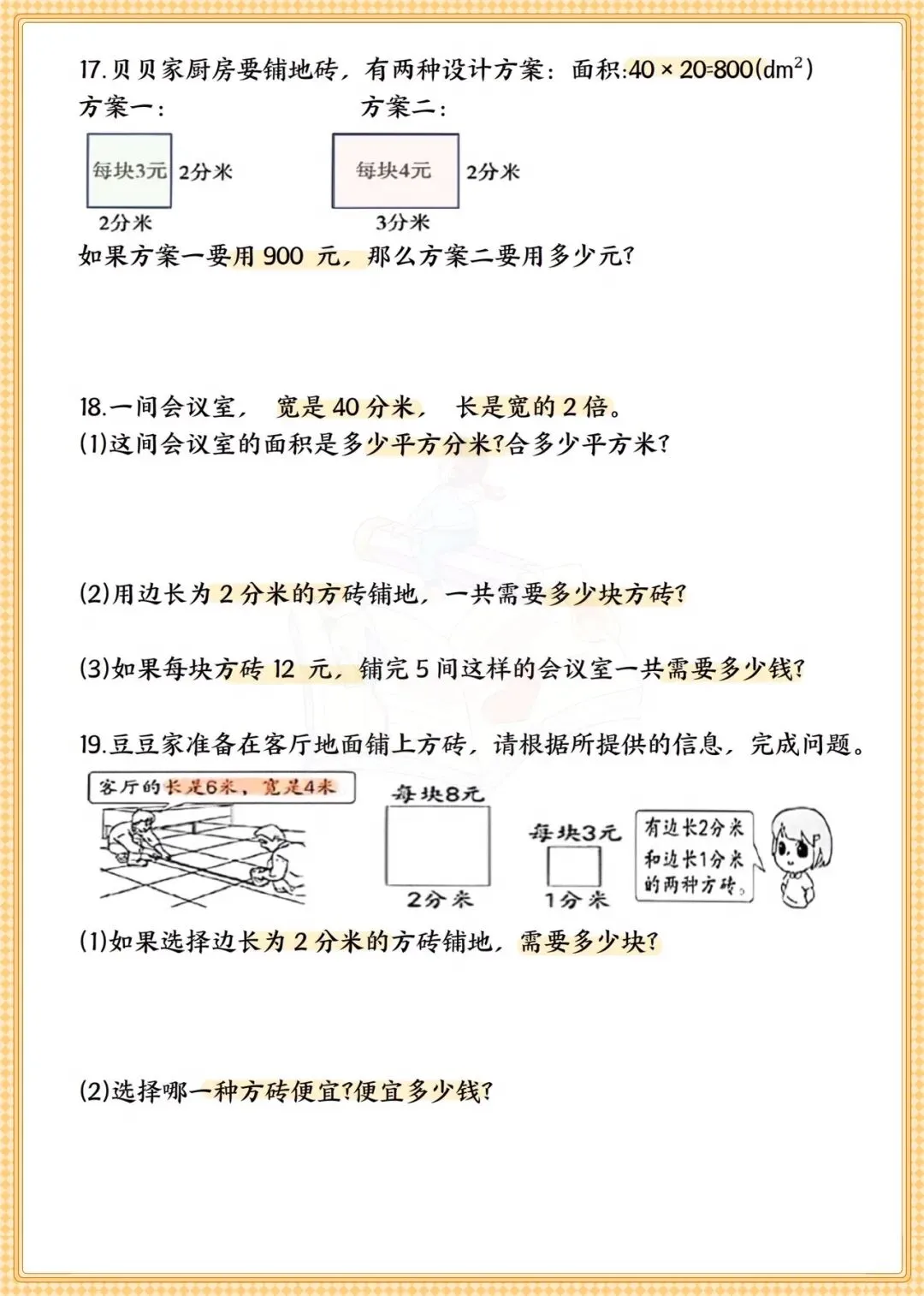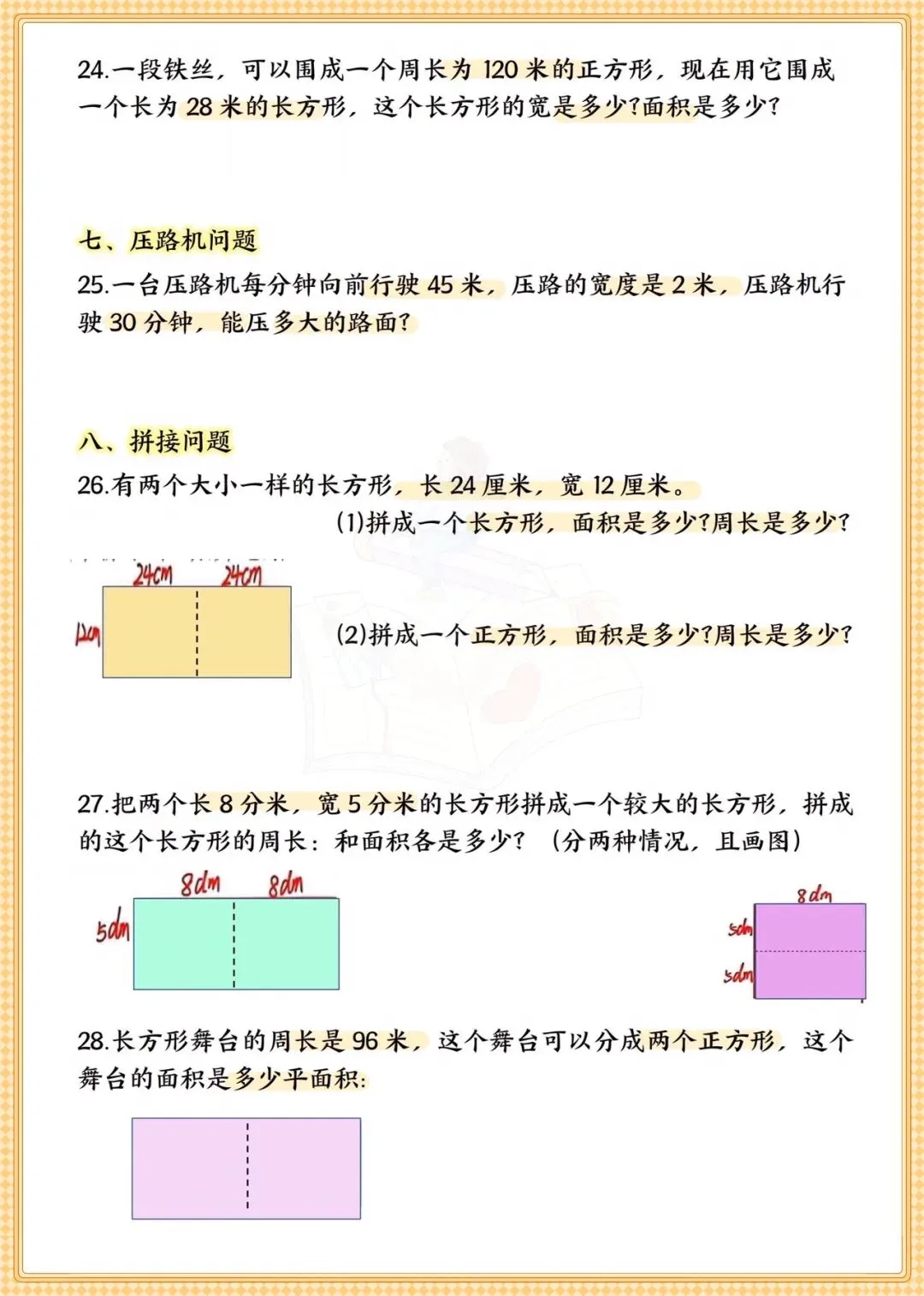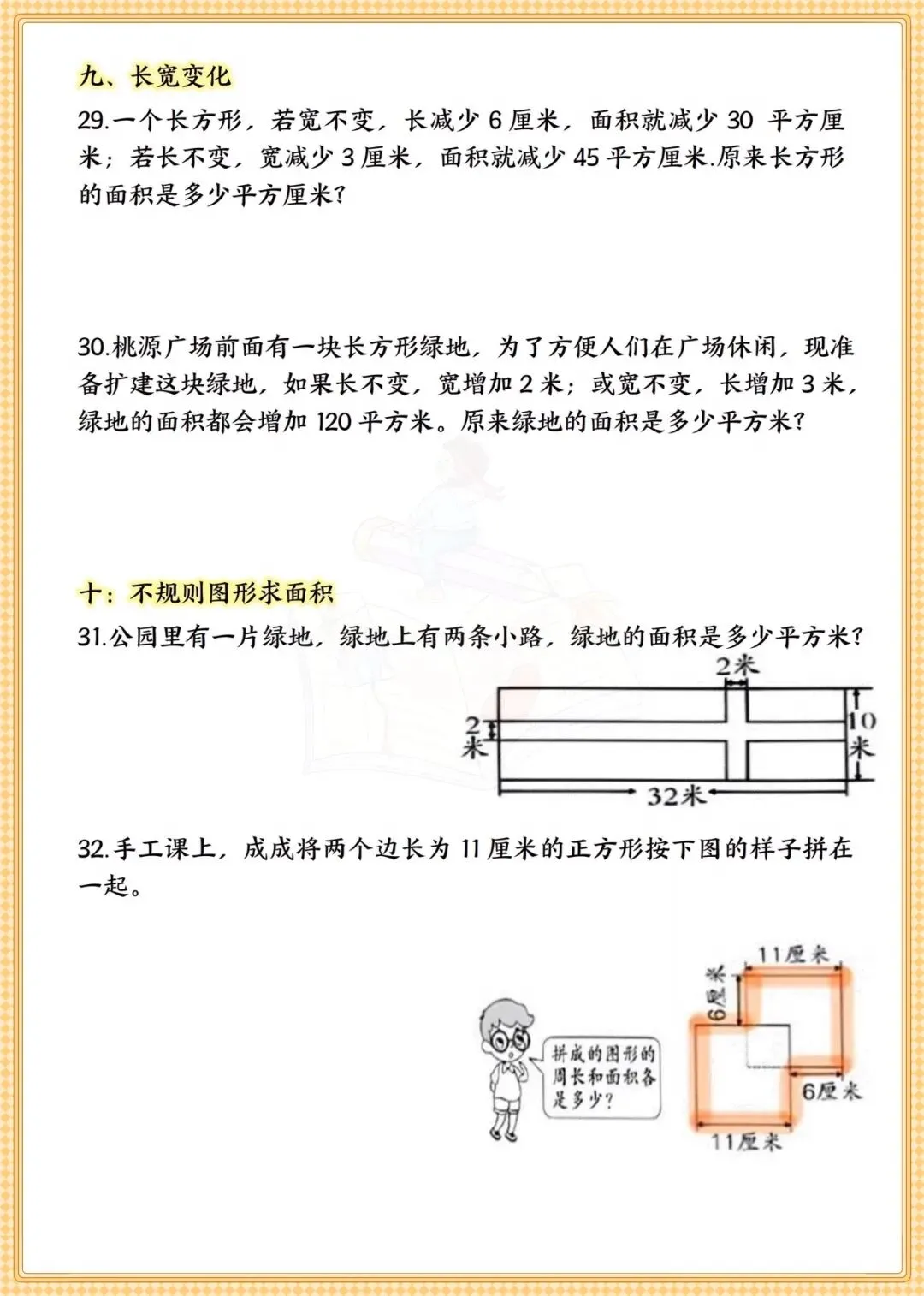 吃透这32道题,三年级面积考点轻松掌握!家有三年级娃的家长注意啦!数学几何板块里,面积是重难点,也是孩子最容易混淆周长与面积、单位换算出错的地方。这份专为孩子定制的《三年级下册数学面积专题+常考易错题》可打印练习,涵盖10大高频题型,囊括周长面积基础计算、围篱笆、铺瓷砖、拼接裁剪等32道经典应用题,从基础公式运用到不规则图形求解,层层递进;易错题板块则通过填空、判断、选择,精准戳中孩子易错点,比如面积单位混淆、边长变化与面积的关系等,帮孩子规避高频失分点。